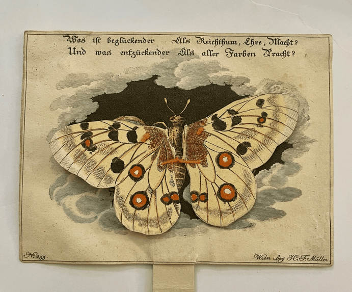 Some of the earliest movable cards were made primarily in Vienna, Austria, and to a lesser extent in France, during the first quarter of the 19th century. These were commercially made and printed using copper engraving on a sheet of stiff rag paper and hand-colored . The parts were then die-cut out and hand assembled, with novel mechanics utilizing a pull tab and silk thread tied into knots to hold the parts together. The back of the card was blank and often had an inscription and date from the owner to the recipient.